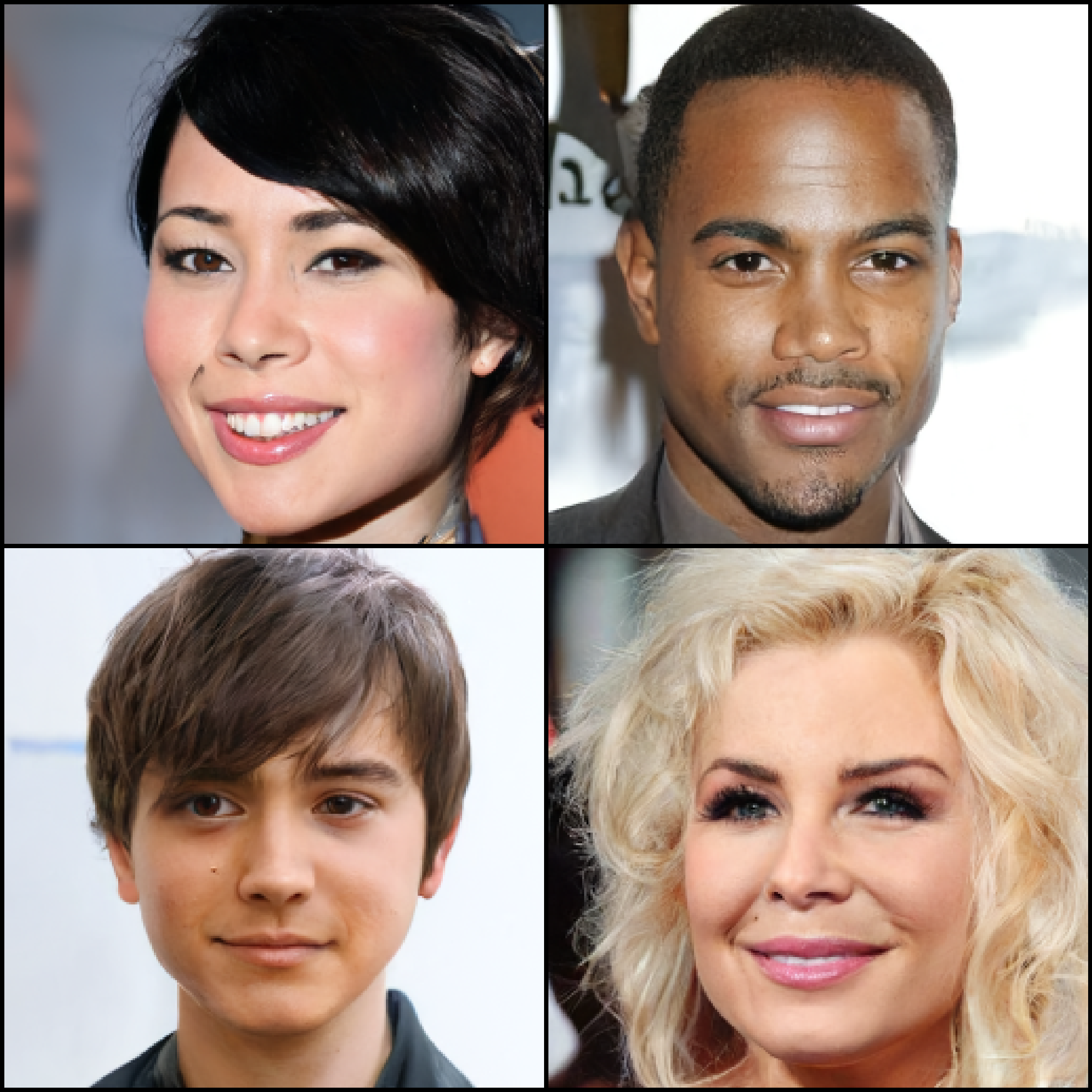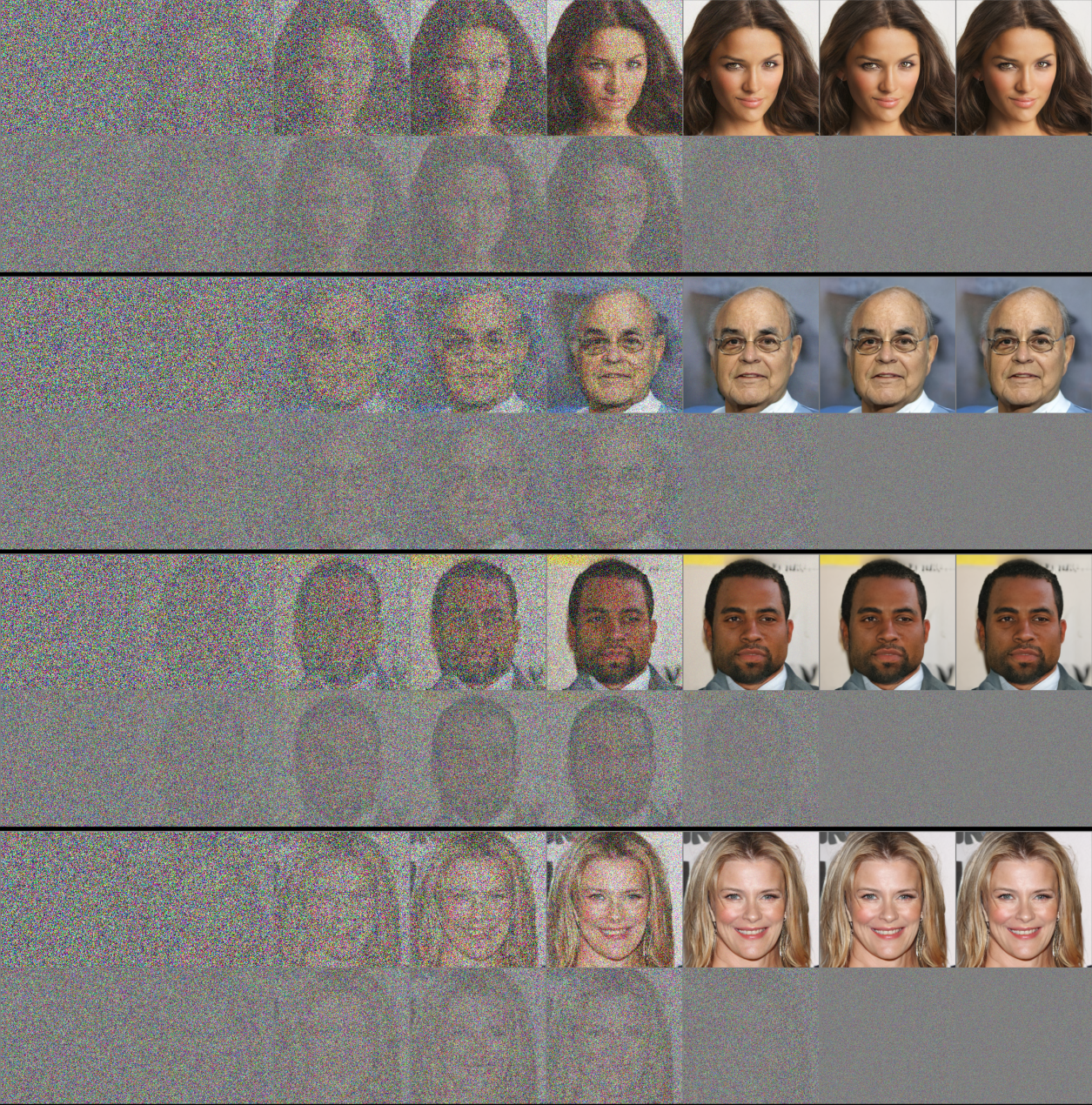 Visualization of the generation paths of samples from our CelebA-HQ-256 model (synthesis uses only 150 steps). Odd and even rows visualize data and velocity variables, respectively. The eight columns correspond to times \(t \in \{1.0, 0.5, 0.3, 0.2, 0.1, 10^{-2}, 10^{-3}, 10^{-5}\}\) (from left to right). The velocity distribution converges to a Normal (different variances) for both \(t \to 0\) and \(t \to 1\). See Appendix F.3 in our paper for visualization details and discussion.