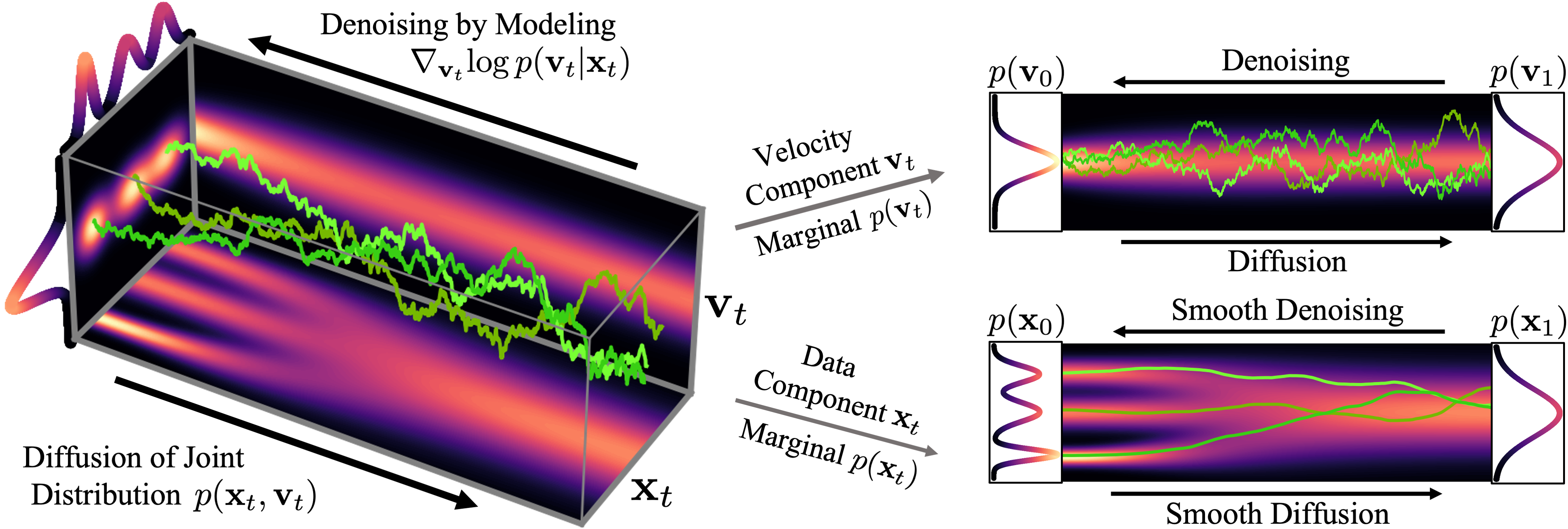 Inspired by statistical mechanics, we propose a novel forward diffusion process, the critically-damped Langevin diffusion (CLD). In CLD, the data variable, \(\bf{x}_t\) (time \(t\) along the diffusion), is augmented with an additional "velocity" variable \(\bf{v}_t\) and a diffusion process is run in the joint data-velocity space. Data and velocity are coupled to each other as in Hamiltonian dynamics, and noise is injected only into the velocity variable. Similarly as in Hamiltonian Monte Carlo, the Hamiltonian component helps to efficiently traverse the joint data-velocity space and to transform the data distribution into the prior distribution more smoothly. We derive the corresponding score matching objective and show that for CLD the neural network is tasked with learning only the score of the conditional distribution of velocity given data \(\nabla_{\bf{v}_t} \log p_t(\bf{v}_t |\bf{x}_t )\), which is arguably easier than learning the score of the diffused data distribution directly. Using techniques from molecular dynamics, we also derive a novel SDE integrator tailored to CLD's reverse-time synthesis SDE.